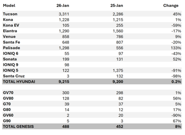 - Combined January sales for Hyundai and Genesis in Canada total 9,703 units.