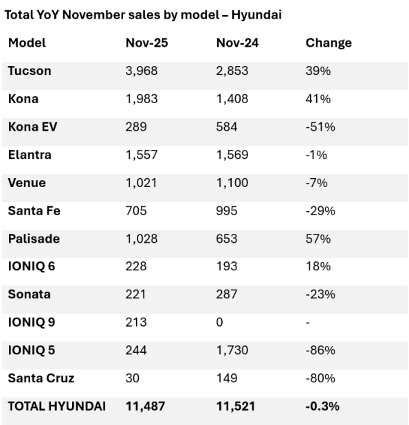 - Tucson once again led the lineup as Hyundai’s top-selling model for November, up 39% compared to this time last year, followed by Kona with a 41% gain.