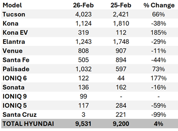 - TUCSON, ELANTRA, and KONA drove record‑breaking February sales.